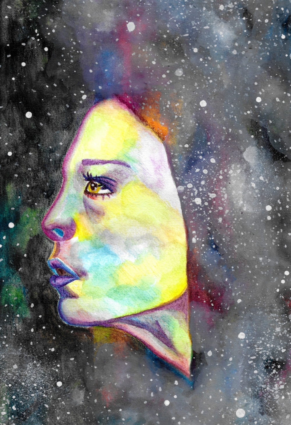 Space MixedMedia Space 2019, Derwent Inktense pencils, watercolors, white ink and gouache on A4 paper. Aiheeseen liittyy